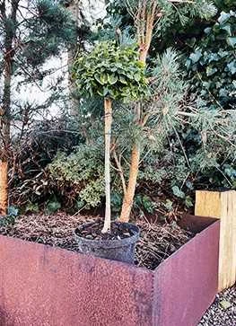 Stedsegrøn podet træ med en tæt kugleformet krone med gulbrogede blade, der bliver let rødlige om vinteren.