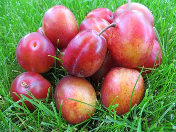 Blommetræet `Victoria` giver store, ovale, rødorange frugter med svag violet kind.
