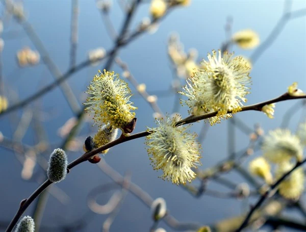 Blomstrer med hvide gæslinger i marts – april.